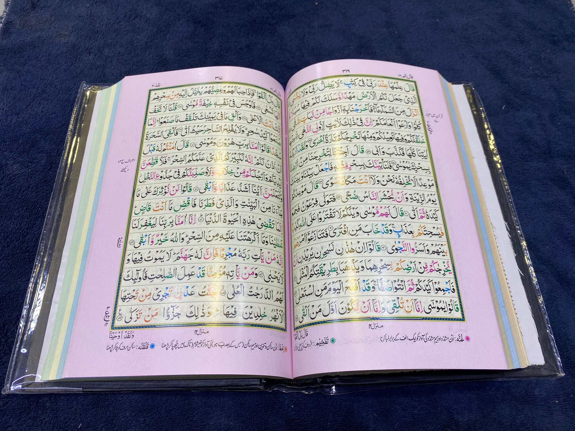 Published by the reputable Hammad Company (Roshan Quran Mahal) in Urdu Bazaar, Lahore, this edition features the specialized Tajweedi format to assist readers in the correct pronunciation and rhythmic recitation of the Arabic text. The Quran is housed in a sophisticated black glossy hardcover, beautifully decorated with intricate purple, blue, and gold-foiled floral patterns. With the editorial supervision of the renowned Sheikh-ul-Qurra Hazrat Qari Raheem Bakhsh (RA), you can trust in the academic and scriptural accuracy of every verse.